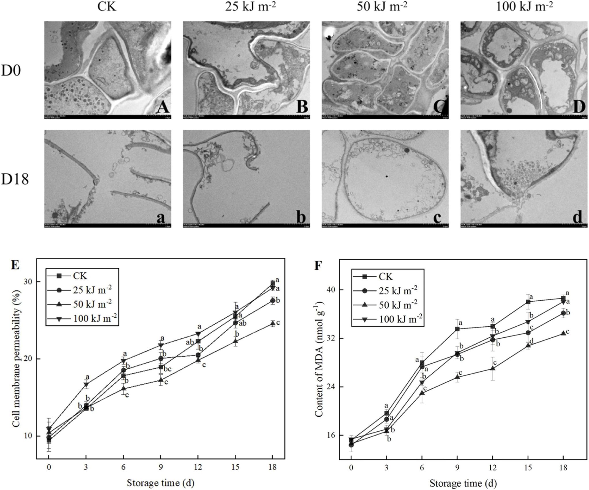 图3 细胞膜超微结构、膜通透性和MDA含量变化