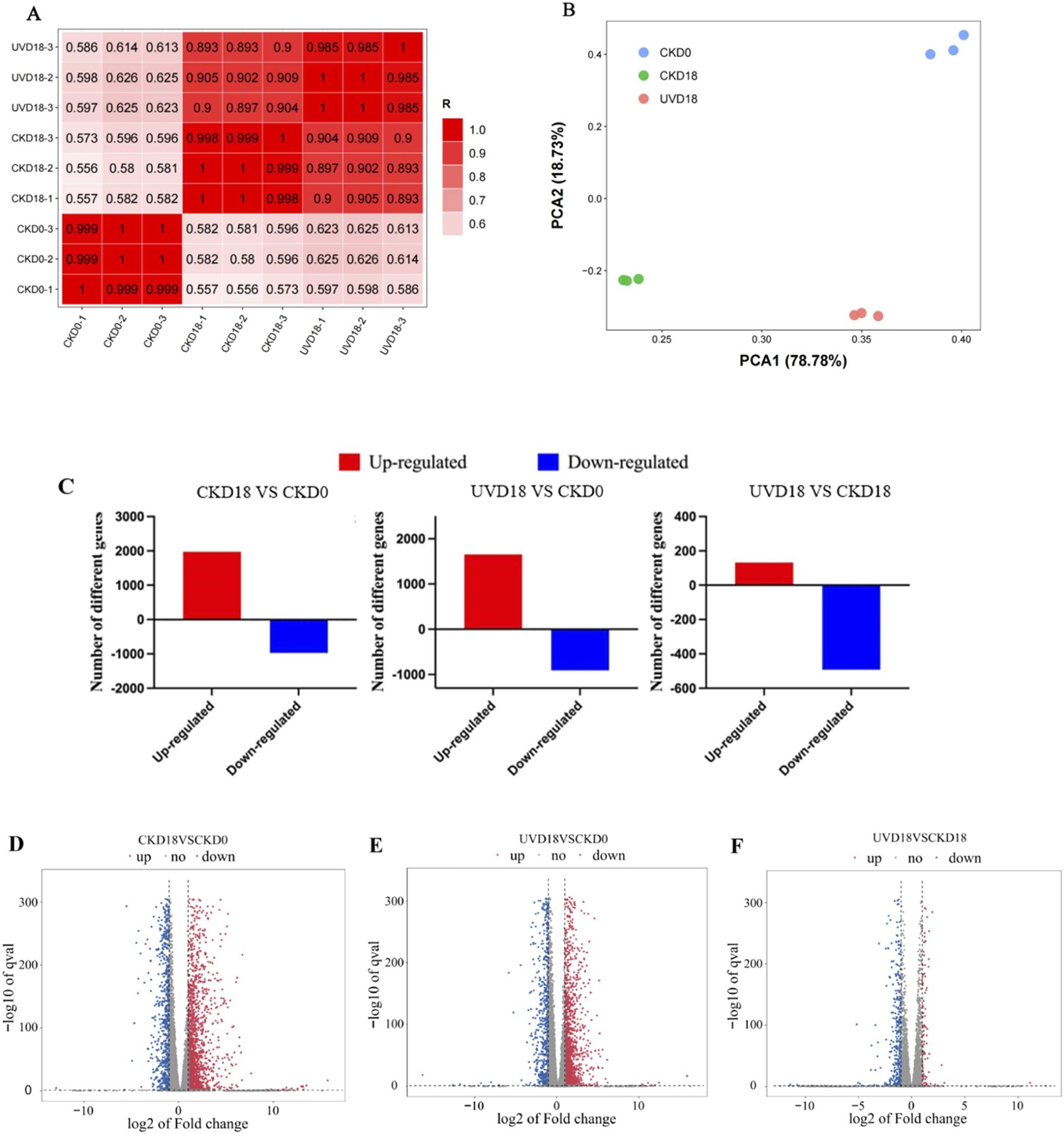 图4转录组样本间相关性分析(A)、PCA分析(B)、差异基因数量(C)及火山图(D-F)