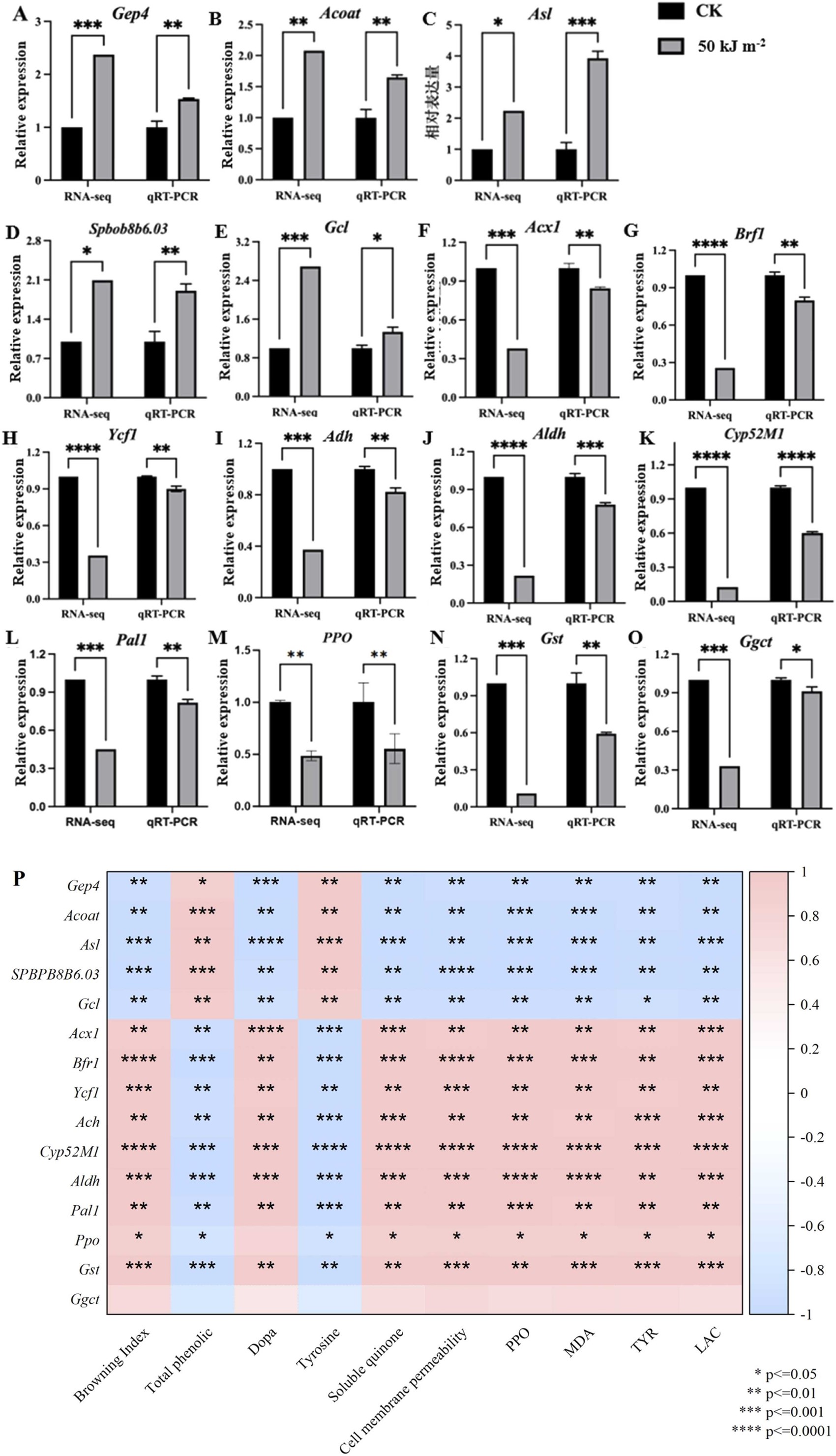 50 kJ/m²的照射有效延缓了褐变产物含量的增加,并抑制了相关酶的活性及对应基因的表达,这证明了褐变过程被延缓。同时细胞膜的完整性及脂肪酸含量得以维持,且细胞膜所受的氧化应激程度得到缓解。转录组分析结果显示,关键差异表达基因主要与脂肪酸代谢、磷脂代谢、色氨酸代谢及谷胱甘肽代谢通路相关。这些结果表明,50 kJ/m²的UV-B照射可能通过维持细胞膜稳态来延缓双孢蘑菇采后褐变。